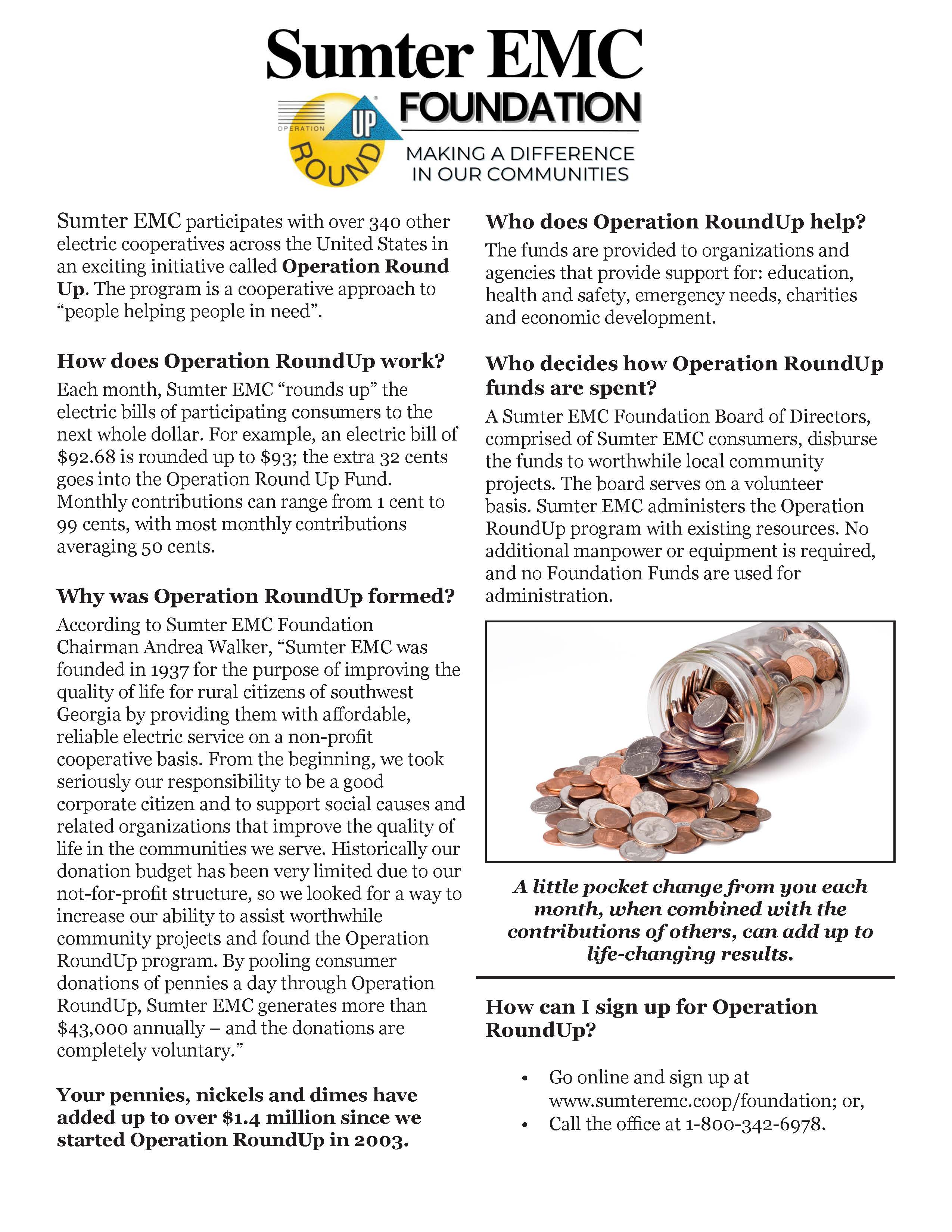 One of the Cooperative Principles that governs Sumter EMC is "Concern for Community" and this program beautifully demonstrates that principle. Operation Round Up® is an easy way for you to make a big difference by supporting local charities and educational projects within our communities without lifting a finger. Operation Round Up® was originally started in 1989 by Palmetto EMC, a co-op in South Carolina and has now been adopted by many co-ops nationwide. This program is designed to assist a variety of worthwhile community, youth, educational and environmental programs within the counties served by Sumter EMC. The process is easy. Your monthly utility bill will be rounded-up to the next whole dollar amount and then disbursed by the Sumter EMC Foundation. The average amount donated each year is around $6, but the most you could ever donate in a single year is $11.88! Where else can you make such an impact with less than $12 a year? Help us make a difference in your community by signing up today!!